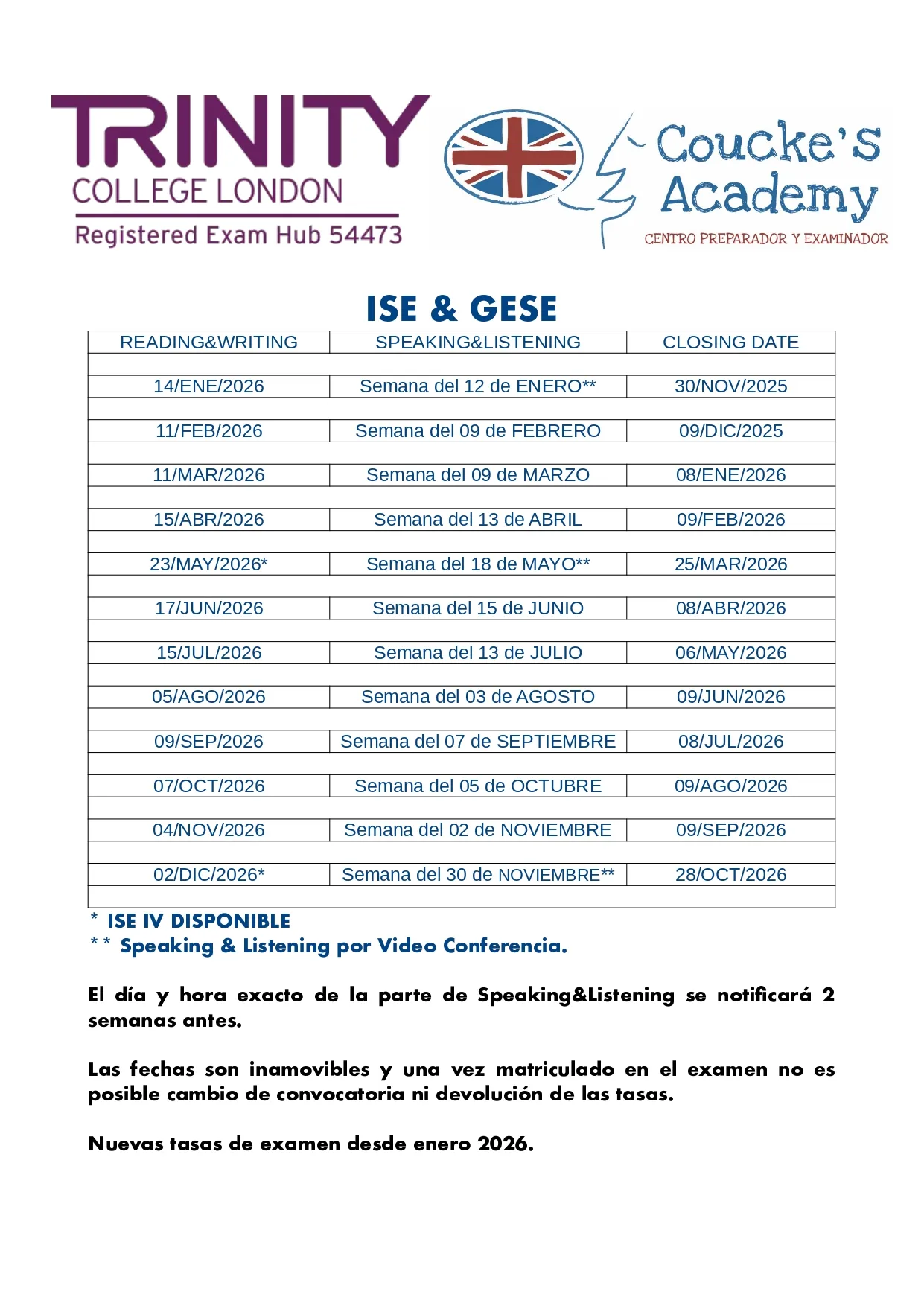 Existen varios tipos de exámenes de Trinity. Nosotros trabajamos principalmente con los ISE y los GESE.